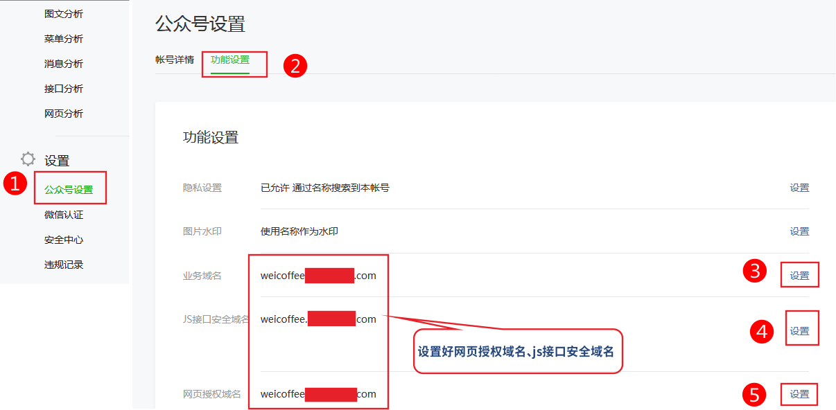 打開https://mp.weixin.qq.com/ 登陸公眾號后 在公眾號設(shè)置 -》功能設(shè)置中檢查網(wǎng)頁授權(quán)域名配置
