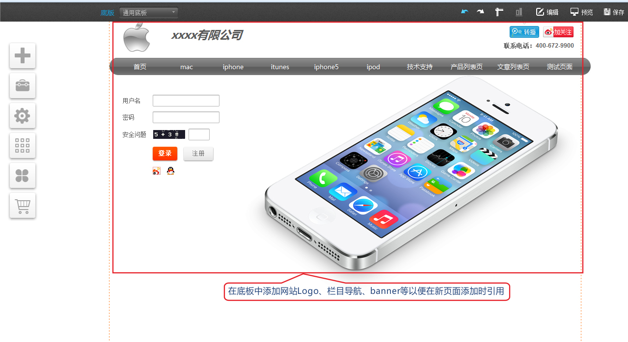 4、在底版中添加logo、banner、導航等以便在新添加的頁面中引用。最后記得點擊右上角的保存按鈕