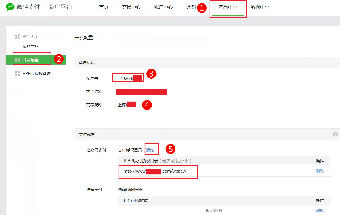登陸 微信商戶平臺 找到產(chǎn)品中心 -》開發(fā)配置 獲取到 商戶號、商家簡稱 如下圖