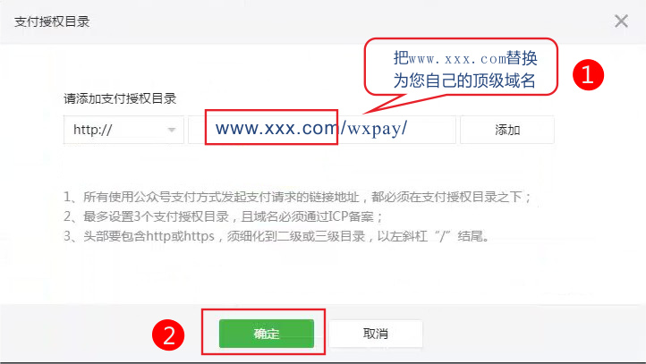 如果您安裝了域名ssl證書,需要把http:// 更換為 https://,支付授權(quán)目錄格式為:綁定的域名+/wxpay/