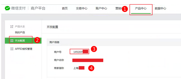 登陸商戶平臺-》產(chǎn)品中心-》開發(fā)配置中獲取微信支付商戶號