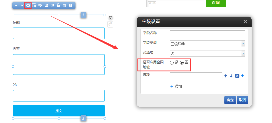 在建站前臺拖出“留言”-“留言表單”插件,點(diǎn)擊字段設(shè)置,字段類型選擇三級聯(lián)動,新增了是否啟用全國地址設(shè)置項(xiàng),選擇是則會自動讀取地區(qū)信息。如圖所示: