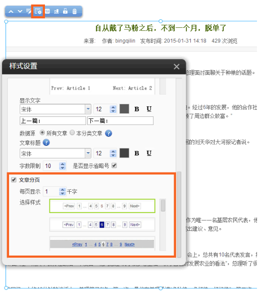 3、 文章詳情支持分頁(yè),用戶可以設(shè)定每頁(yè)顯示多少字,多種分頁(yè)樣式選擇
