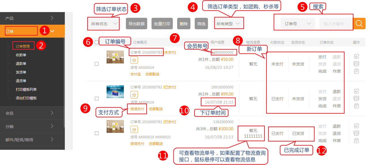 后臺(tái)依次點(diǎn)擊 后臺(tái)管理---訂單管理,可以看到訂單管理界面