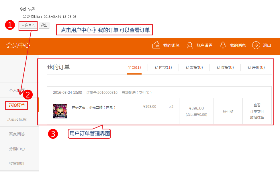 提示:前臺(tái)會(huì)員中心,訂單的狀態(tài)會(huì)隨后臺(tái)訂單狀態(tài)的改變而變化,會(huì)員可以即時(shí)看到訂單處理情況!