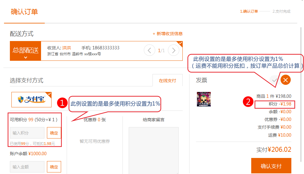 每次最多使用積分設(shè)置為1%(運(yùn)費(fèi)不能用積分抵扣,按訂單產(chǎn)品總價計算)