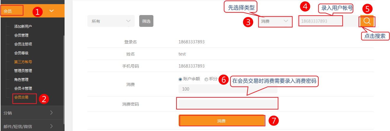 如:在會員管理-》會員交易-》消費(fèi)中使用
