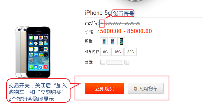 1,交易開關(guān),關(guān)閉后“加入購物車”和“立刻購買”2個按鈕會隱藏顯示。