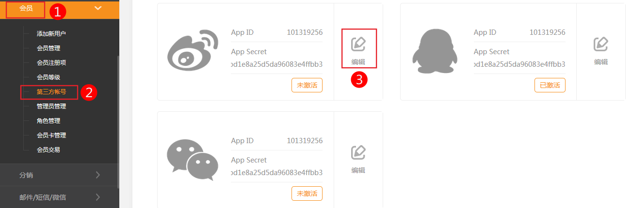 1.在網(wǎng)站管理中依次點(diǎn)擊 電子商務(wù)-會(huì)員管理-第三方帳號(hào)-》編輯新浪微博