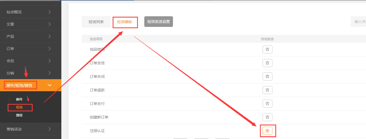 6.由于短信運(yùn)營商,需要進(jìn)行測試審核,還必須參考截圖所示,將需要短信自動觸發(fā)發(fā)送的設(shè)置項設(shè)置為啟用。