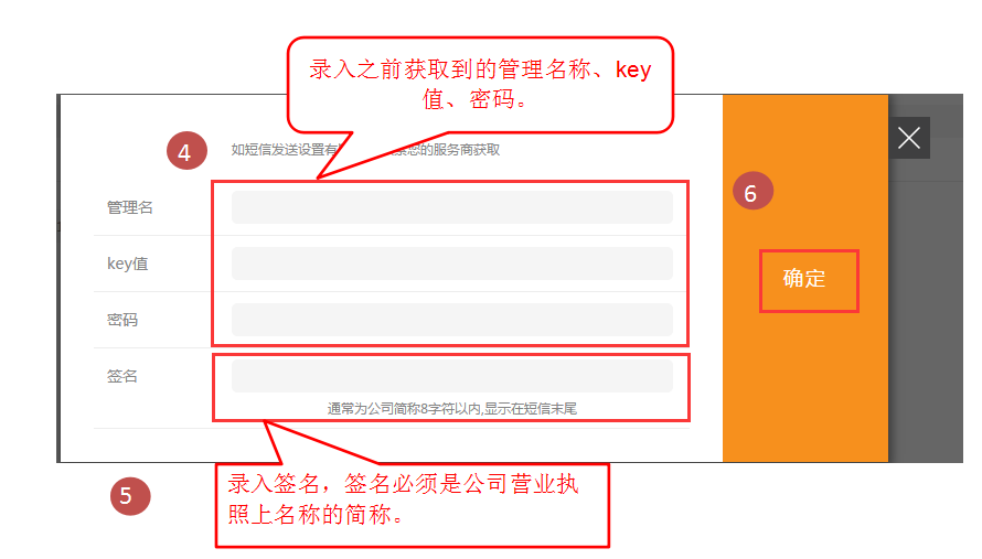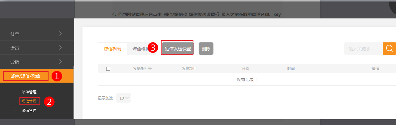 4. 回到網(wǎng)站管理后臺點(diǎn)擊 郵件/短信-》短信發(fā)送設(shè)置-》錄入之前獲取的管理名稱、key值、密碼和簽名