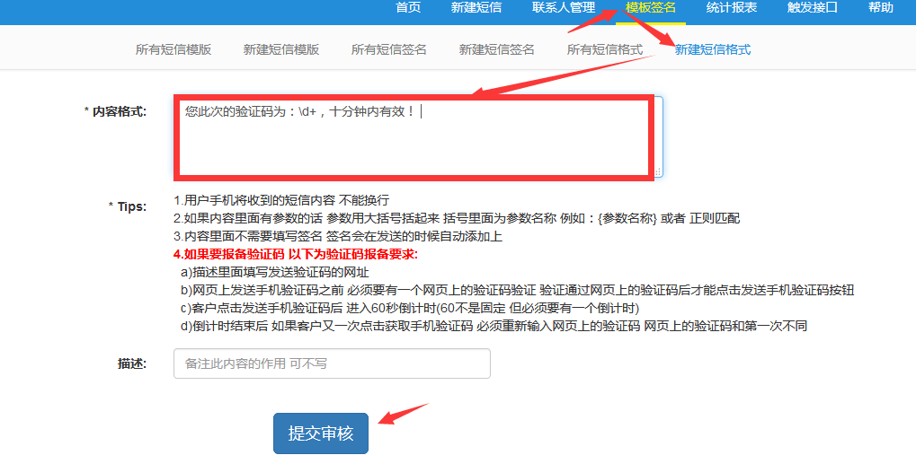 2. 還需要在短信管理平臺添加短信格式,通過審核后就可以在網(wǎng)站使用短信功能。