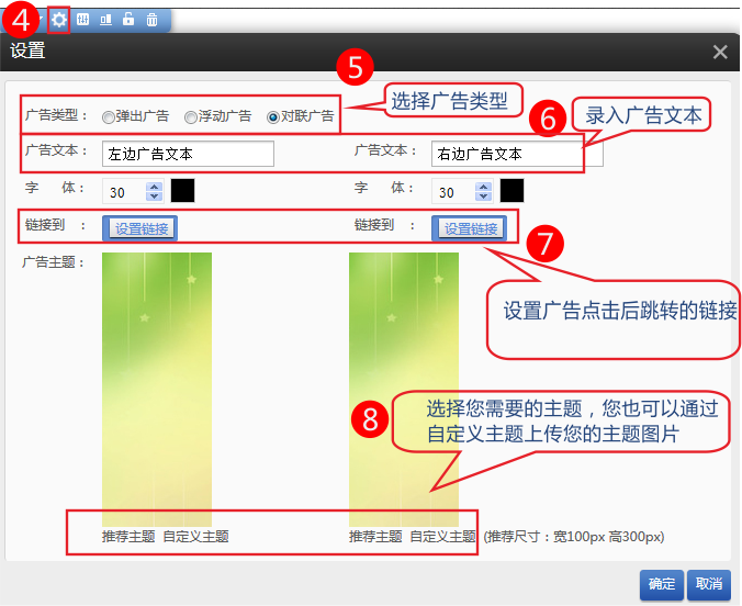 可有效吸引訪客眼球,傳遞網(wǎng)站的重要信息(促銷活動,主打產(chǎn)品,節(jié)日問候等) 支持右下角彈出,頁面漂浮,對聯(lián)3種廣告類型,支持設(shè)置鏈接. 每種廣告類型系統(tǒng)提供12種素材供用戶選擇,同時支持客戶自定義廣告背景圖片.