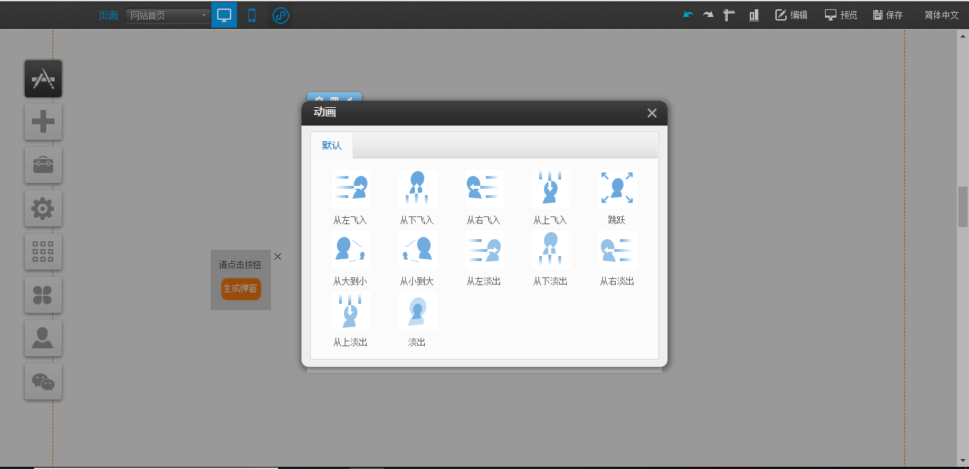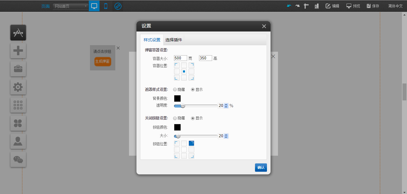 1.在PC編輯器中,點(diǎn)開“插件”,拖入“彈窗容器”插件,點(diǎn)擊“生成彈窗”,在“彈窗容器”中點(diǎn)擊“樣式設(shè)置”可以對(duì)該容器的大小、關(guān)閉按鈕樣式以及遮罩樣式進(jìn)行設(shè)置,點(diǎn)擊“選擇插件”對(duì)可以拖入“文本”、“圖片”、“視頻”、“線條”、“站內(nèi)搜索”以及“按鈕”插件,“動(dòng)畫設(shè)置”是可以對(duì)該模塊的展現(xiàn)形式進(jìn)行設(shè)置,編輯完成后點(diǎn)擊白色容器的“X”只是暫時(shí)在編輯器中隱藏了該編輯模塊,如果需要徹底刪除,需要在“生成彈窗”處關(guān)閉,并且支持將“生成彈窗”任意拖動(dòng)到編輯器中的任意地方放置,如圖所示: