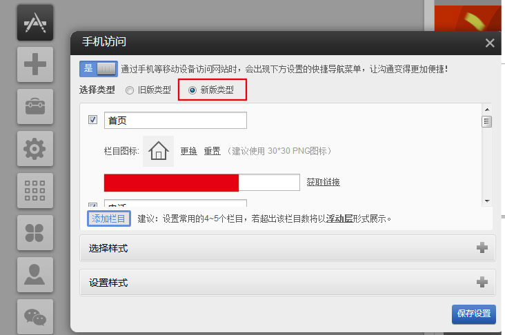 營(yíng)銷(xiāo)版「手機(jī)訪問(wèn)」功能(如圖①~②)在通過(guò)手機(jī)等移動(dòng)設(shè)備瀏覽網(wǎng)站時(shí),會(huì)在網(wǎng)站底部固定顯示設(shè)置的快捷導(dǎo)航菜單,讓溝通變得更加便捷。該功能提供了6種不同風(fēng)格的主題(如圖②-B),支持自定義欄目(包括標(biāo)題、圖標(biāo)及鏈接)以及定制個(gè)性化欄目樣式(如圖②-A)
