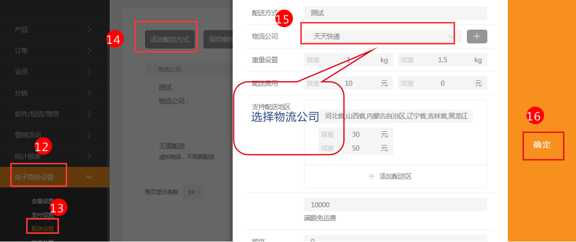 6.在電子商務設置-配送設置中,添加配送方式,選擇好相應的物流公司。