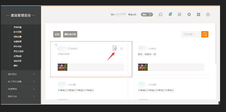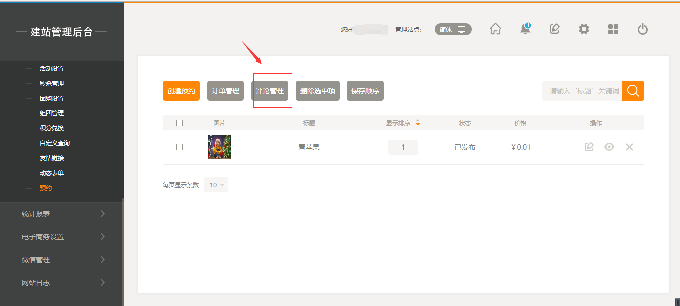 1.“后臺(tái)管理”-“預(yù)約”-“評(píng)論管理”,點(diǎn)擊進(jìn)入后,可以選擇對(duì)評(píng)論進(jìn)行刪除和隱藏,操作之后,在前臺(tái)頁(yè)面中則不會(huì)顯示該評(píng)論的內(nèi)容,如圖所示: