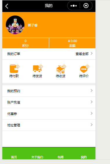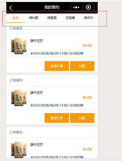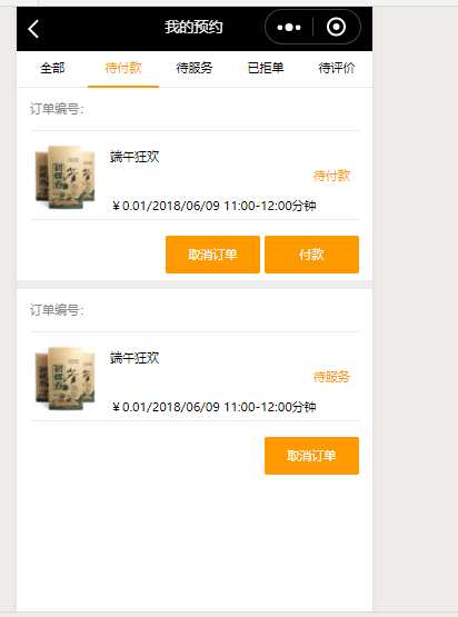 11.“用戶中心”頁(yè)面中有“我的預(yù)約”,點(diǎn)擊之后,頁(yè)面中會(huì)有訂單的狀態(tài)“待付款”、“待服務(wù)”“已拒單”“待評(píng)價(jià)”以及“全部”,點(diǎn)擊都可以看到該狀態(tài)下的訂單內(nèi)容: