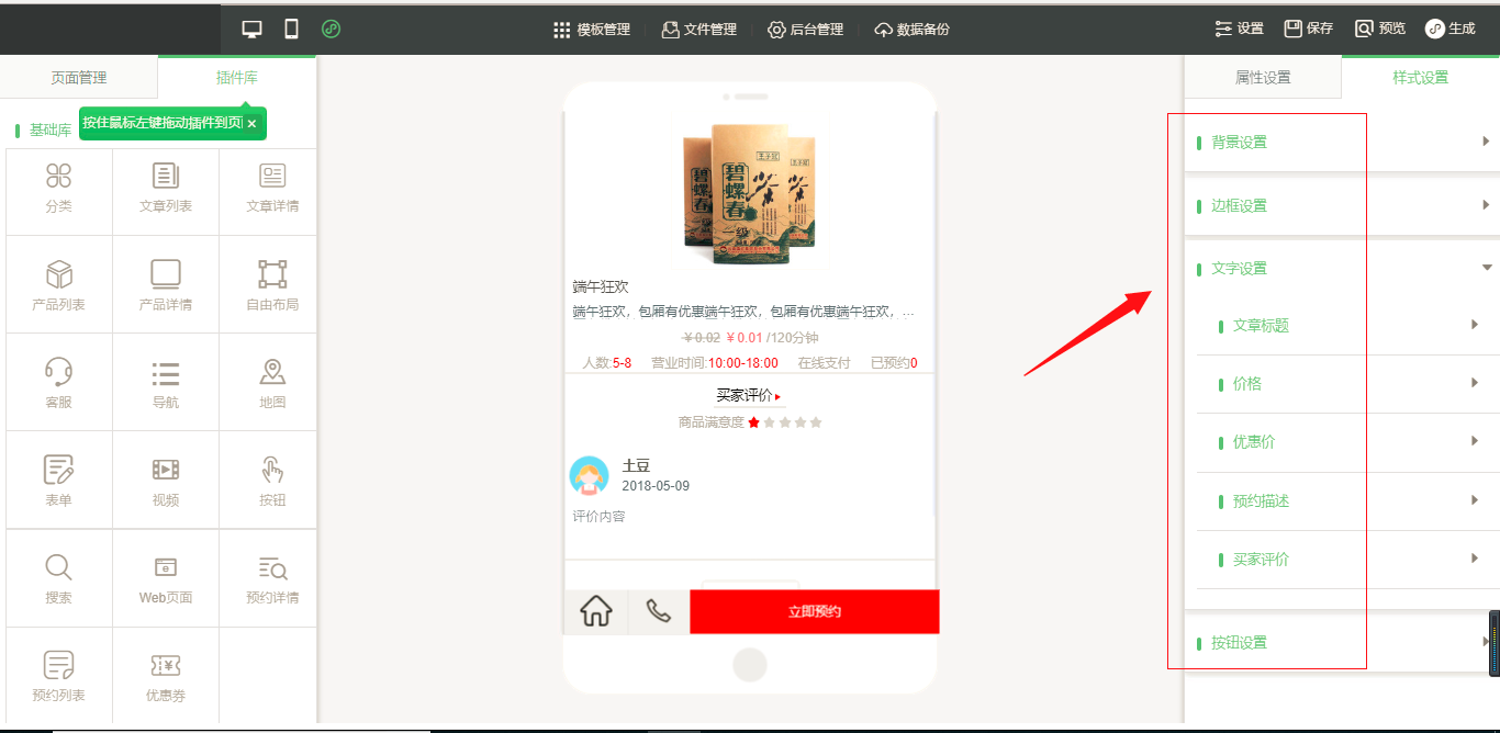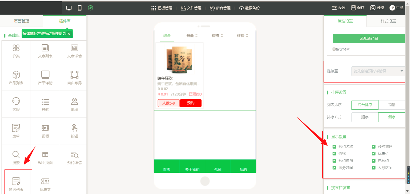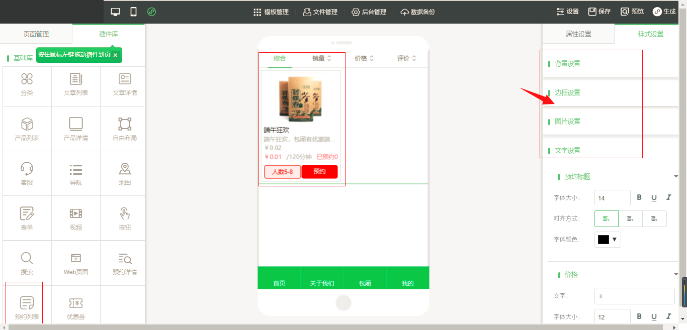 7.在小程序編輯器中拖入“預(yù)約列表”插件,會(huì)顯示除在后臺(tái)添加的預(yù)約產(chǎn)品列表,在屬性設(shè)置中我們可以進(jìn)行一些“排序設(shè)置”、“顯示設(shè)置”和“搜索欄設(shè)置”等,在“樣式設(shè)置”中同樣也有一些設(shè)置項(xiàng),比如“文字設(shè)置”就可以改變頁(yè)面中的文字顏色,字體等內(nèi)容,(注意的是要將該列表鏈接至含有“預(yù)約詳情”的頁(yè)面),如圖所示: