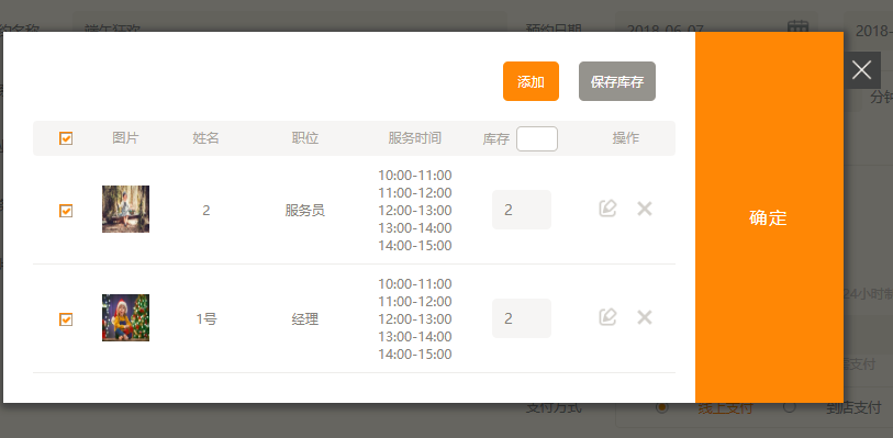 (庫(kù)存說(shuō)明:服務(wù)員的庫(kù)存,也就是這個(gè)時(shí)間段內(nèi)這個(gè)服務(wù)員可被預(yù)約的次數(shù)是2次,即總的次數(shù))