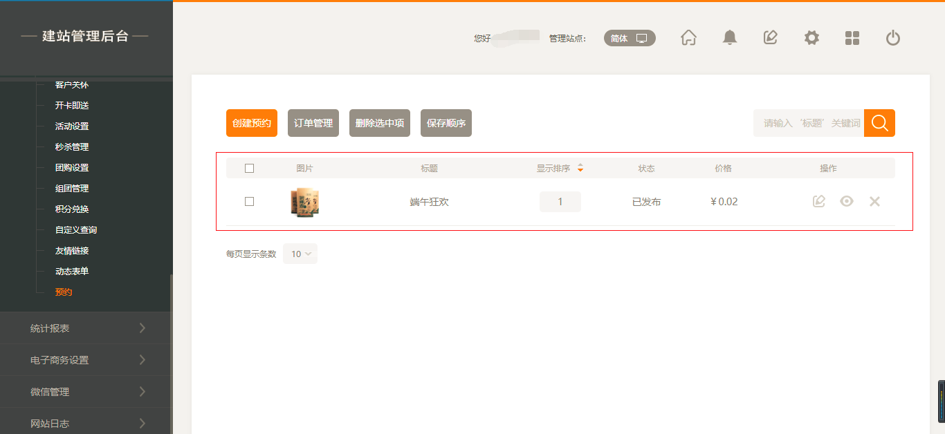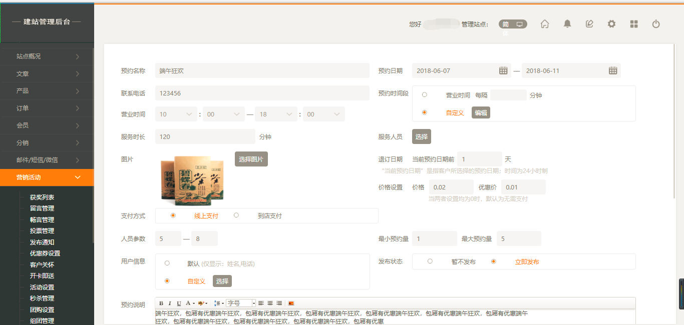1.后臺(tái)“小程序應(yīng)用”-“預(yù)約”中,點(diǎn)擊“創(chuàng)建預(yù)約”,里面可以添加該預(yù)約產(chǎn)品的信息內(nèi)容,點(diǎn)擊“保存”后,頁(yè)面會(huì)顯示該預(yù)約內(nèi)容。