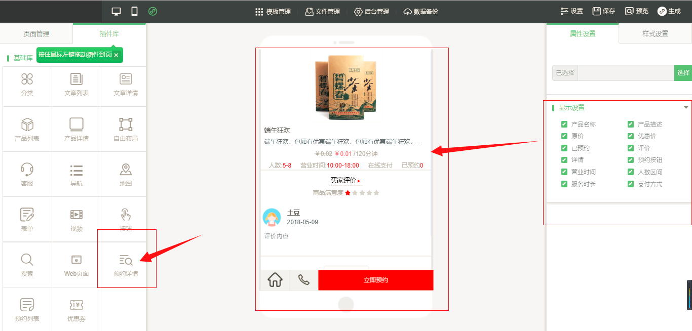 8.在編輯器中,拖入一個(gè)“預(yù)約詳情”的頁(yè)面,里面的內(nèi)容為預(yù)約的詳情信息,在“屬性設(shè)置”中同樣有“顯示設(shè)置”;在“樣式設(shè)置”中可以進(jìn)行文字以及按鈕等設(shè)置項(xiàng)的設(shè)置,如圖所示: