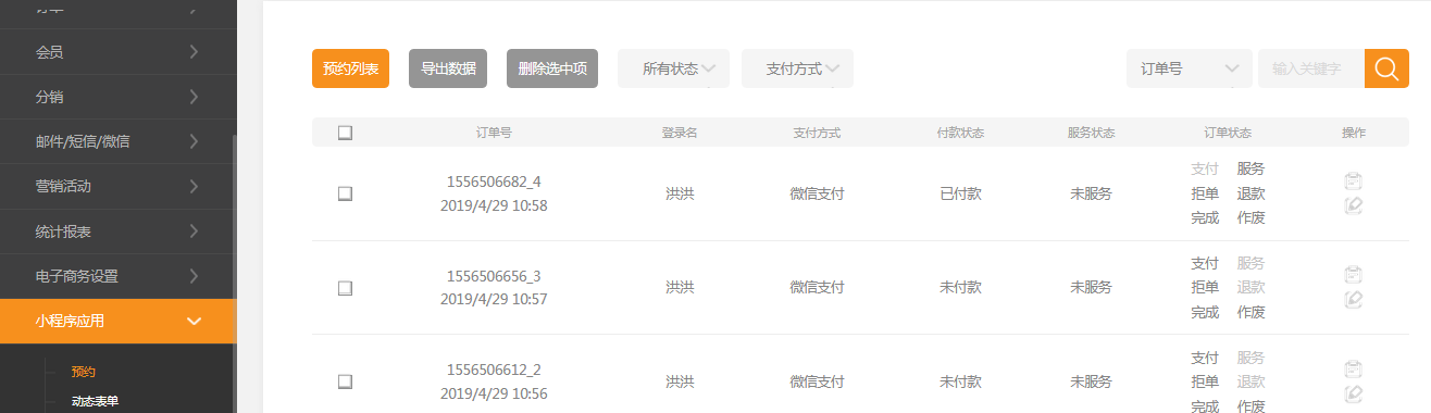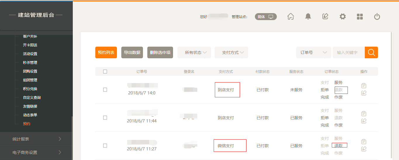 6.后臺(tái)“訂單列表”中可以操作前臺(tái)提交的訂單狀態(tài),比如:“支付”“服務(wù)”“拒單”等,需要注意的是,當(dāng)“支付方式”為“無(wú)需支付”或“線下支付”時(shí)“退款”項(xiàng)不能操作,如圖所示: