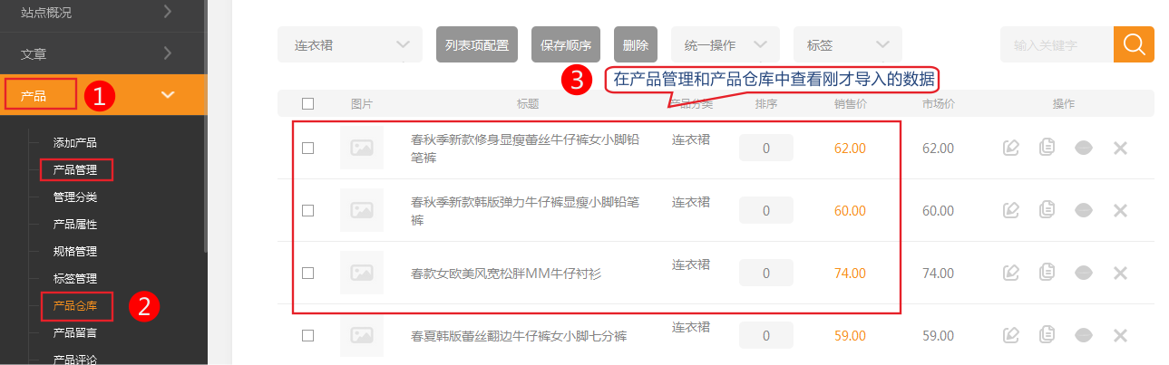 5、在產(chǎn)品管理和產(chǎn)品倉庫中查看剛才導(dǎo)入的數(shù)據(jù)