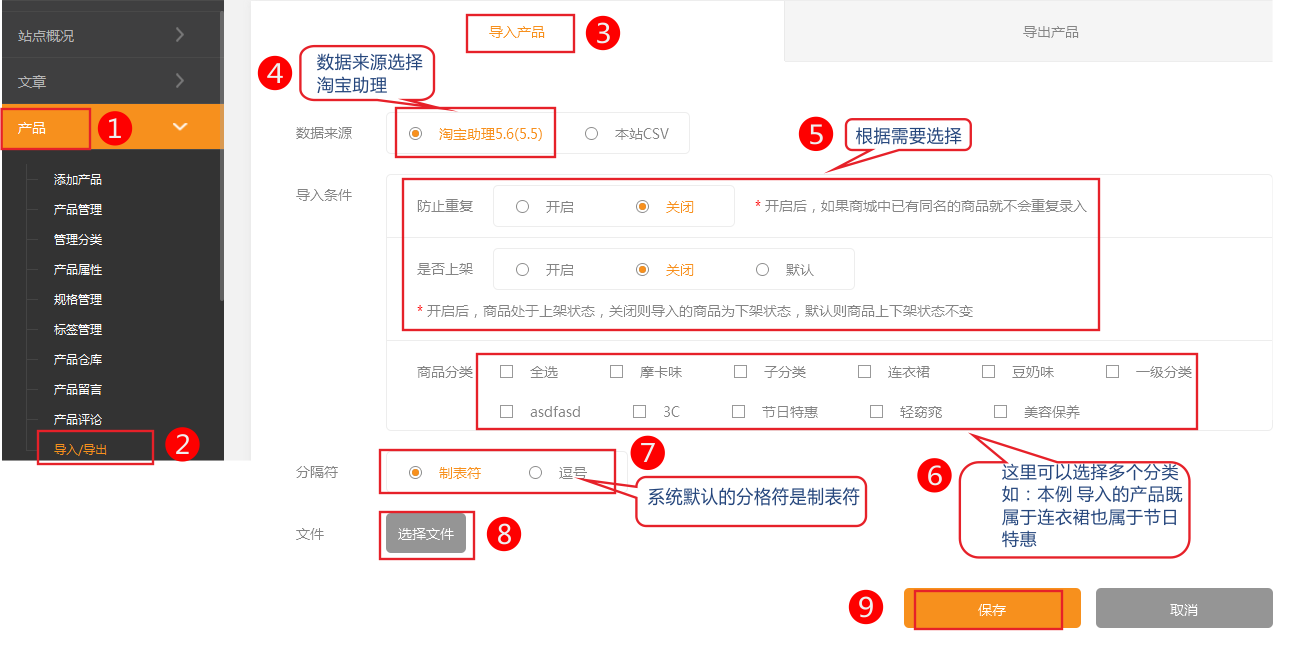注意:選擇分類時(shí)可以多選,選擇后商品從屬于多個分類,所有導(dǎo)入的產(chǎn)品都屬于你選擇的這些分類了。如果有多個分類的商品需要導(dǎo)入單獨(dú)的分類,請分批導(dǎo)入。