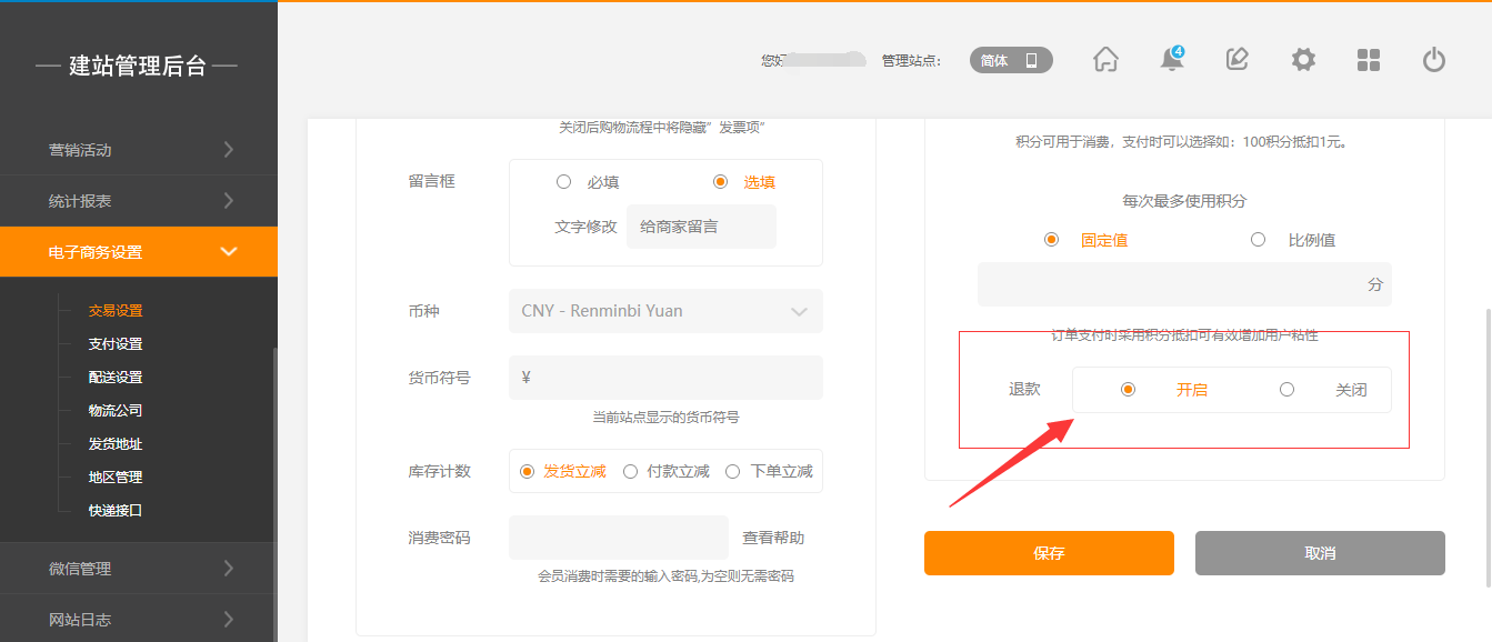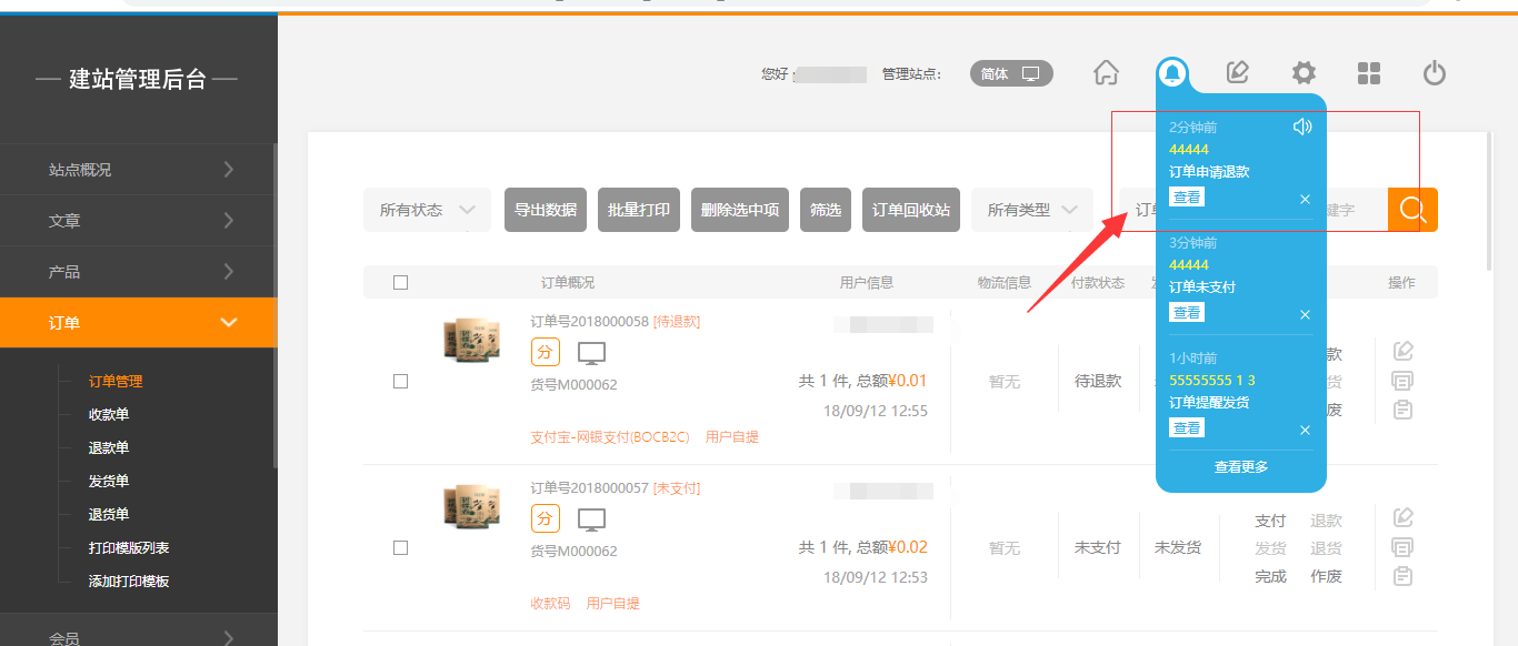 在后臺(tái),“電子商務(wù)設(shè)置”-“交易設(shè)置”中,有一個(gè)退款的操作,當(dāng)開啟該操作時(shí),在前臺(tái)用戶頁(yè)面可以直接申請(qǐng)退款,后臺(tái)消息提醒中也會(huì)有相應(yīng)的提示,點(diǎn)擊“查看”即可(注:“退款”默認(rèn)為關(guān)閉狀態(tài)),如圖所示: