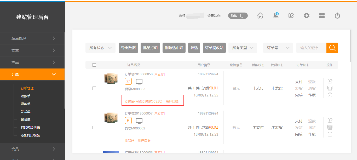 1. 在建站后臺(tái),“訂單”-“訂單管理”頁(yè)面,當(dāng)訂單支付方式為微信且用戶申請(qǐng)退款,現(xiàn)在只要配置正確證書,點(diǎn)擊“保存”即可原路退款,如圖所示:
