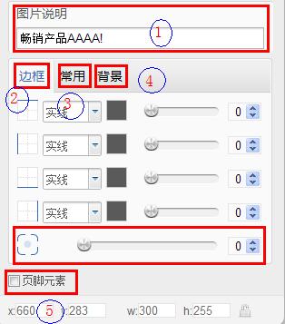 在圖片“屬性”的設(shè)置界面的下半部分,有5個主要的功能:圖片說明、圖片模塊邊框、常用、圖片模塊背景和頁腳元素。