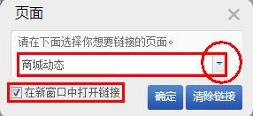 “頁面”:是指可以將圖片鏈接到您網(wǎng)站上面的某個頁面, 屬于站內(nèi)鏈接。設(shè)置好后,客戶點擊這個圖片,就會打開目標(biāo)的頁面以達(dá)到展示更多內(nèi)容的目的。如下圖中鏈接指向“商城動態(tài)”,則訪客點擊這張圖片時,會打開“商城動態(tài)”這個頁面。