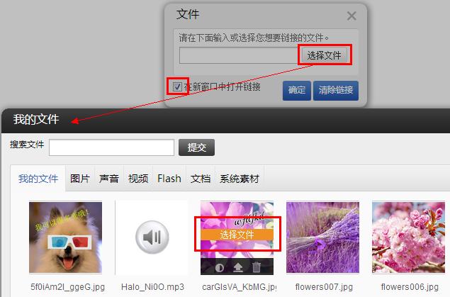 “文件”:是指可以將圖片鏈接到您已上傳在“我的文件”中的文件(如jpg,pdf,word,mp3等等)。當(dāng)點擊該圖片時,系統(tǒng)會調(diào)用訪客本地電腦的相關(guān)程序并打開相應(yīng)的文件。注意:如果訪客本地客戶端沒有可以支持的軟件或者版本不支持,將無法打開這個文件。添加的方式如下圖:選擇好文件后確定,再保存即可。