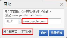 “站外鏈接”:是指可以將圖片鏈接到互聯(lián)網(wǎng)上的某個頁面或某個站點, 只要您把地址填進(jìn)去即可。如下圖,以www.google.com為例,勾選“在新窗口打開鏈接”可以在新增的選項卡中打開www.google.com的頁面。