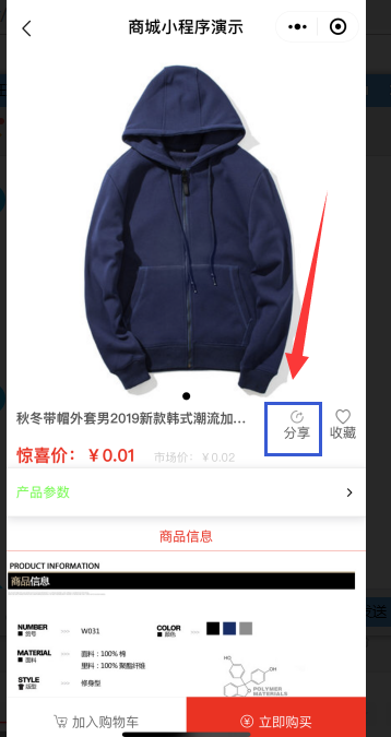1. 在小程序編輯器-產(chǎn)品詳情中,點(diǎn)擊“屬性設(shè)置”選擇“分享”,則可將該商品制作為海報(bào)進(jìn)行分享,客戶掃碼后即可進(jìn)入到該商品的產(chǎn)品詳情頁(yè)中,如圖所示: