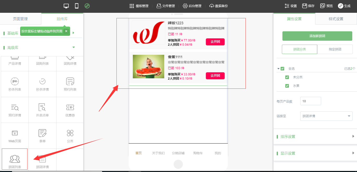 2.在小程序編輯器中,拖入“拼團(tuán)列表”以及“拼團(tuán)詳情”,在“屬性設(shè)置”與“樣式設(shè)置”中設(shè)置好頁面所需的樣式,點(diǎn)擊保存即可,如圖所示: