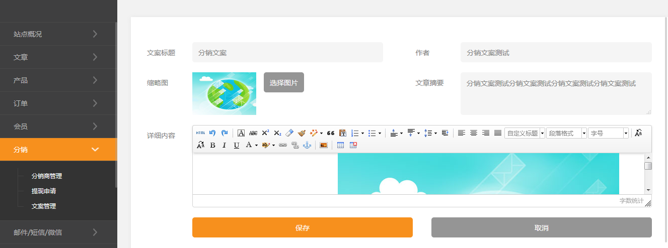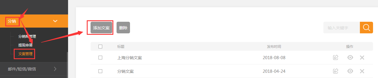 1、在網(wǎng)站后臺依次點擊 分銷-》文案管理-》添加文案