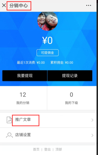 3.微信商進入會員-》分銷中心-》點擊推廣文章進行推廣(一般分享到朋友圈或轉(zhuǎn)發(fā)給好友)
