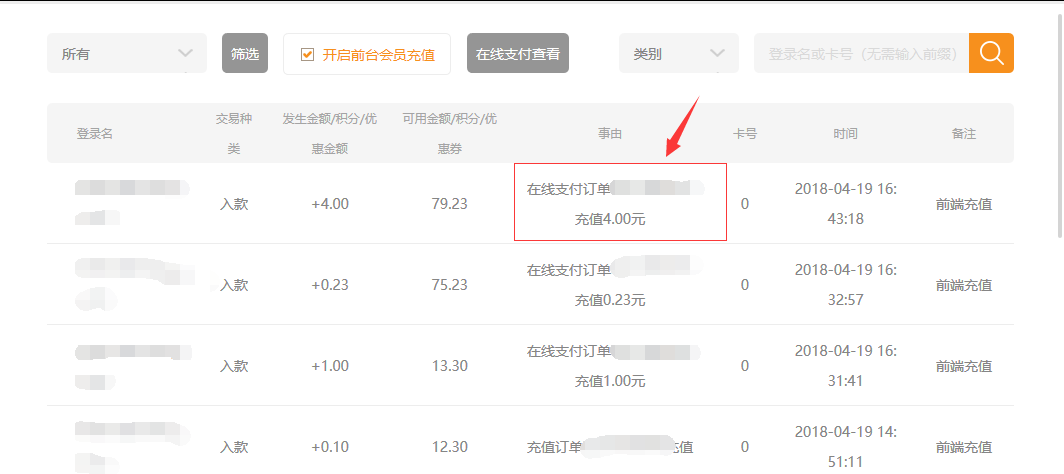 ⑦.在后臺會員交易中,可以看到所有支付成功的訂單(后臺充值和前臺充值),為了區(qū)分訂單,在事由中有描述,如下圖: