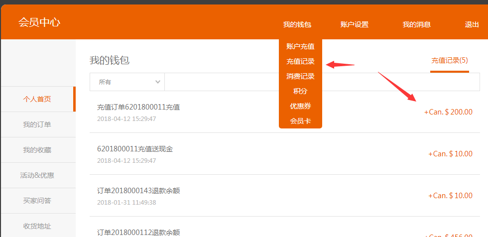 ③.開啟之后,前臺會員才可以看到充值入口。以pc為例,進入會員中心---我的錢包增加了賬戶充值和充值記錄