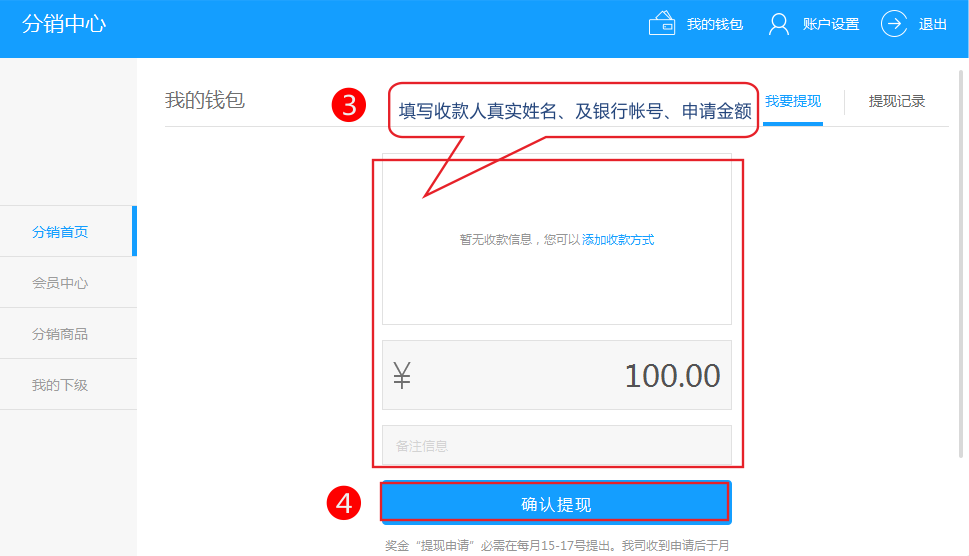 2.用戶(hù)在 用戶(hù)中心-》分銷(xiāo)中心-》提現(xiàn)申請(qǐng) -》填寫(xiě)銀行帳號(hào)和收款人真實(shí)姓名管理員審核通過(guò)后通過(guò)網(wǎng)銀支付給分銷(xiāo)商