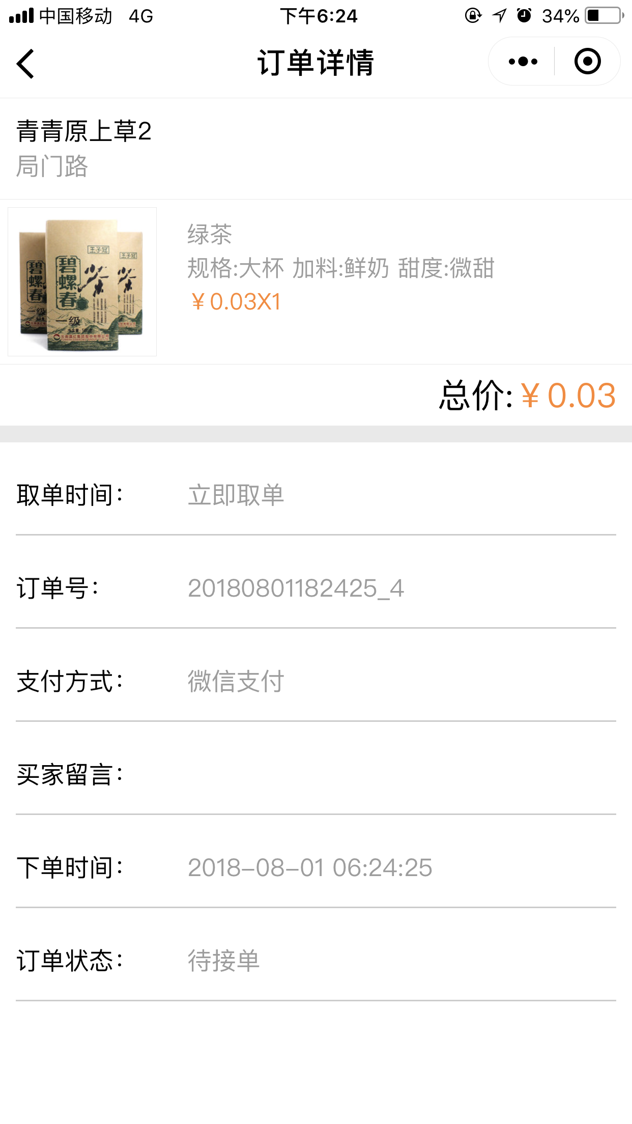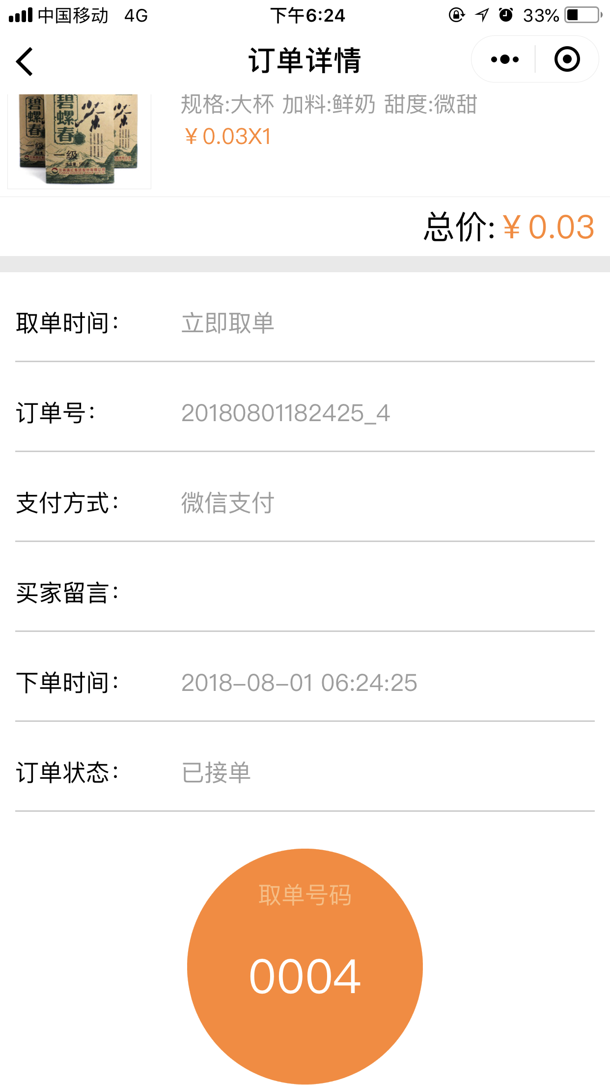 4.在前臺,用戶點(diǎn)擊“開始點(diǎn)單”可以根據(jù)位置匹配到最近的店面,并且可以選擇取餐的方式“立即取餐”或“稍晚取餐”,進(jìn)入點(diǎn)單列表頁我們添加菜品時,可以選擇我們在后臺添加的“配料”、“口味”、以及“規(guī)格”等,選擇完畢之后,點(diǎn)擊“去結(jié)算”跳轉(zhuǎn)到提交訂單頁面,取單時間根據(jù)用戶的選擇會顯示為“立即取單”或者為“取單的時間點(diǎn)”,提交訂單后,會跳轉(zhuǎn)到“訂單詳情”頁面,當(dāng)商家在后臺點(diǎn)擊“接單”接單后,會有“取餐碼”顯示出來,如圖所示: