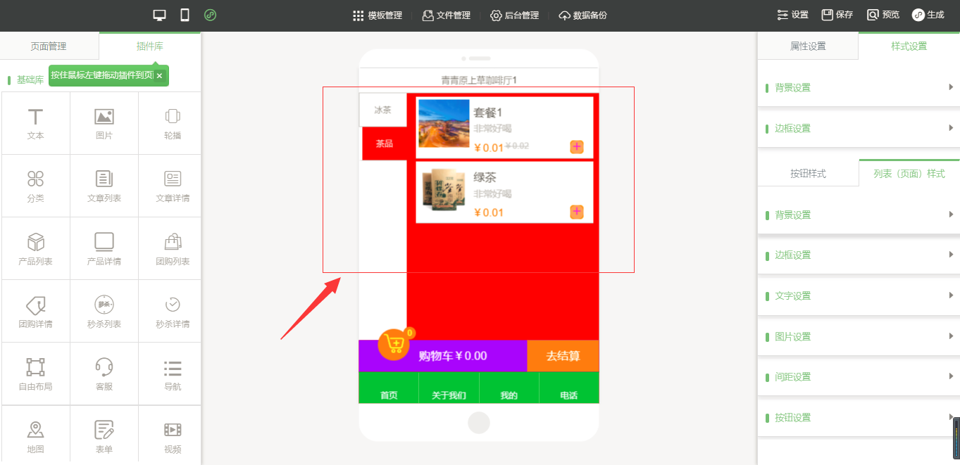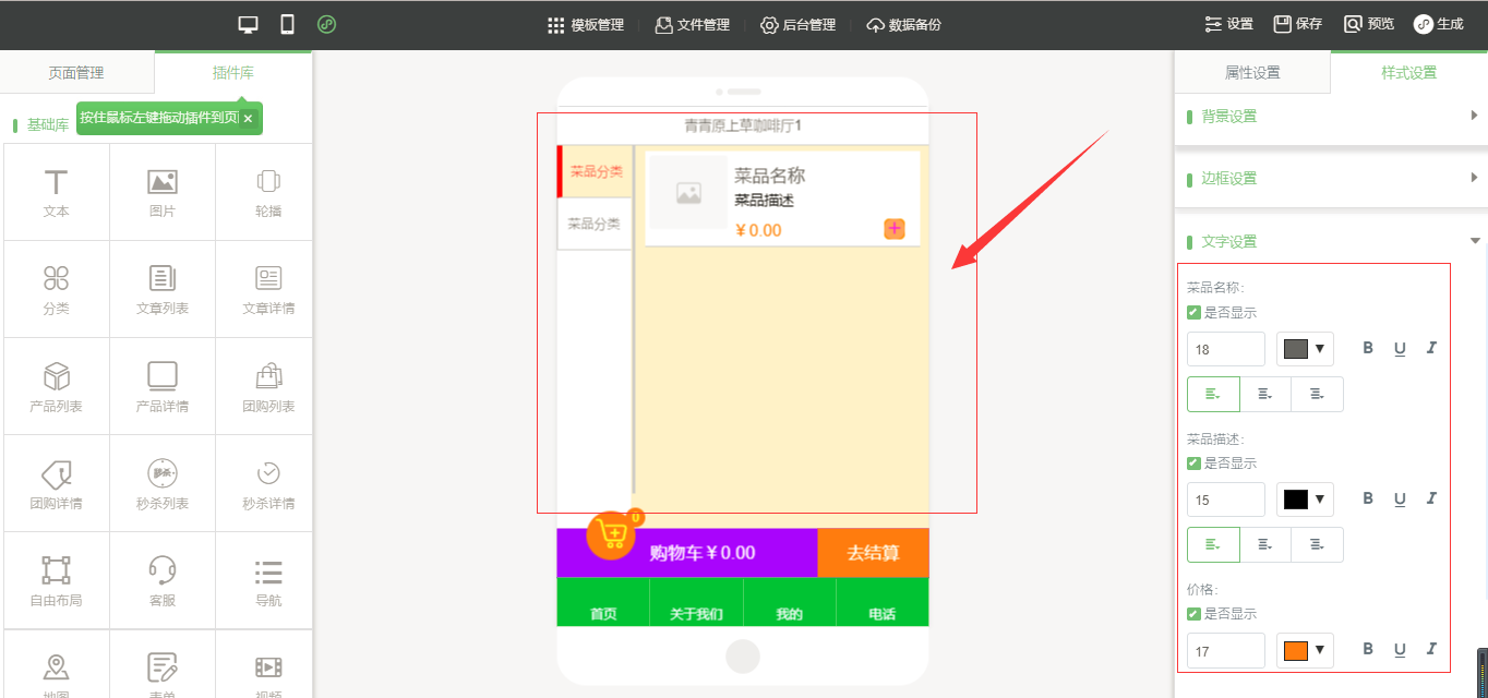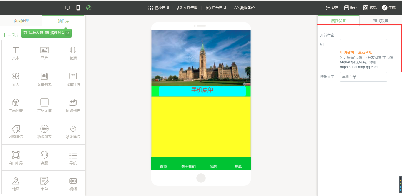 3.在小程序編輯器中,拖入插件“手機(jī)點(diǎn)單”,該插件為內(nèi)頁插件,我們可以在頁面中給小程序頁面進(jìn)行布局,然后點(diǎn)擊“開始點(diǎn)單”按鈕進(jìn)行屬性及樣式設(shè)置,由于需要店面的準(zhǔn)確定位,因此需要申請地圖的API密鑰,具體操作可以看幫助文檔,在樣式設(shè)置中,“背景設(shè)置”與“邊框設(shè)置”是全局設(shè)置,是針對該小程序插件頁面的整體設(shè)置,“按鈕樣式”則是僅針對于“手機(jī)點(diǎn)單”入口按鈕的設(shè)置;“列表(頁面)設(shè)置”是針對該菜品列表頁的設(shè)置,里面的“文字設(shè)置”中可以設(shè)置需要的顯示項(xiàng),設(shè)置完成之后點(diǎn)擊保存即可(注:當(dāng)后臺沒有添加任何數(shù)據(jù)時,該列表頁中會出現(xiàn)一組假的數(shù)據(jù),僅供參考使用,當(dāng)后臺添加數(shù)據(jù)之后,該列表會自動換成真實(shí)數(shù)據(jù)),如圖所示: