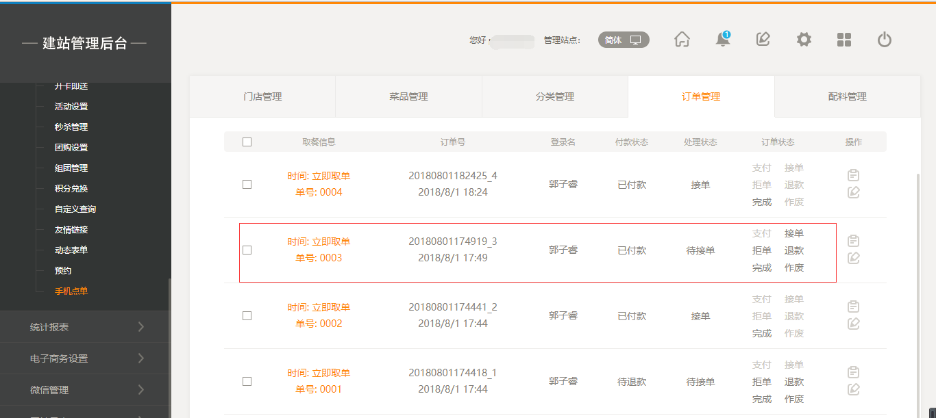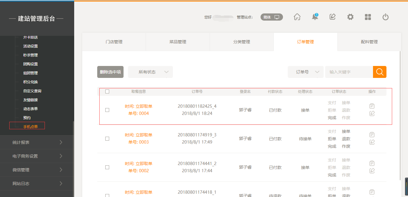 后臺外賣訂單界面