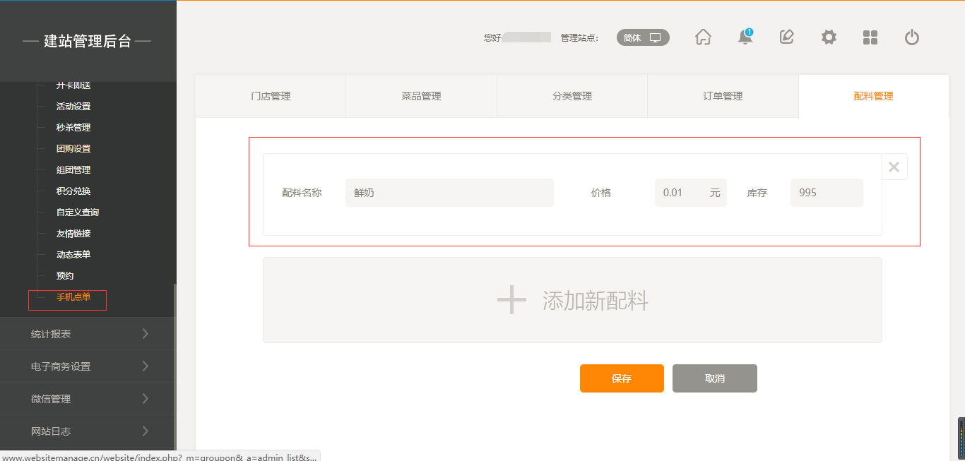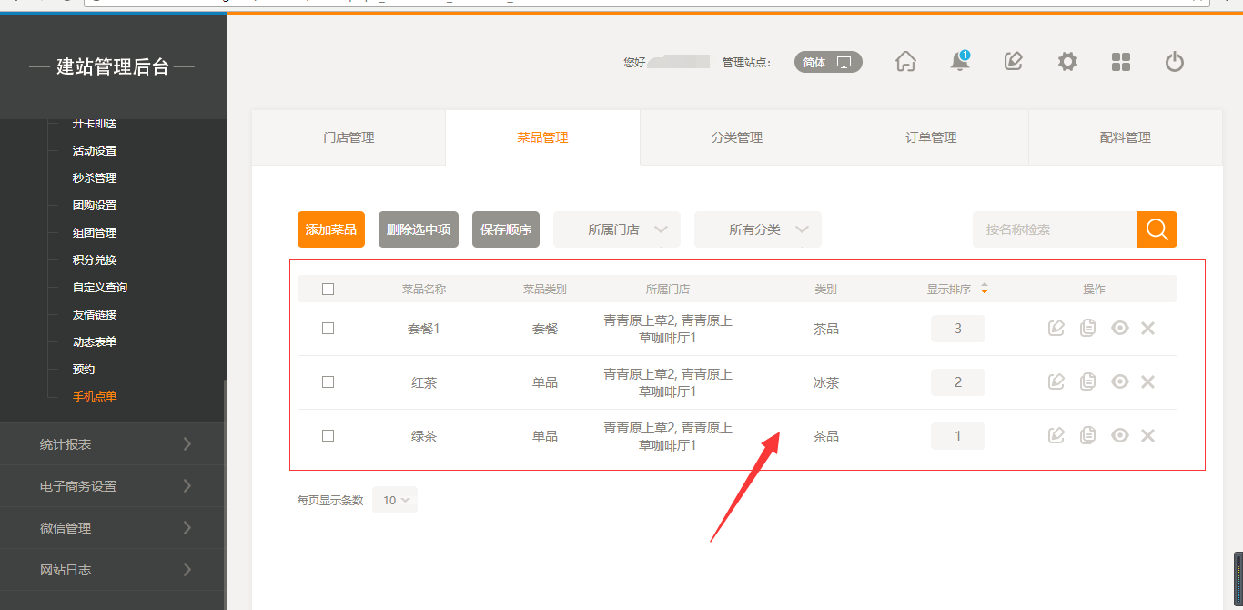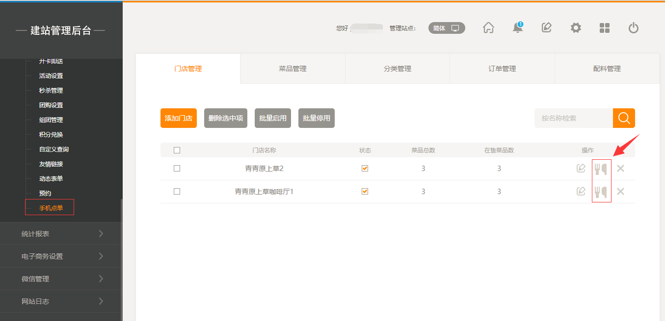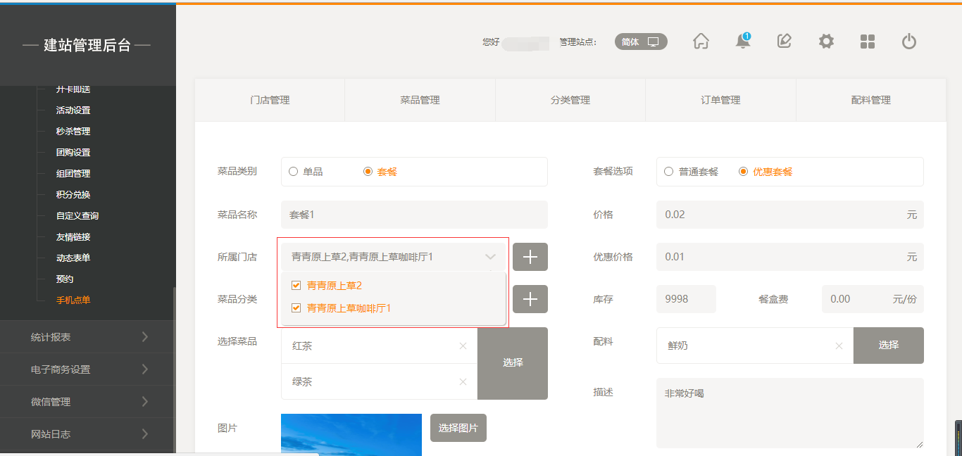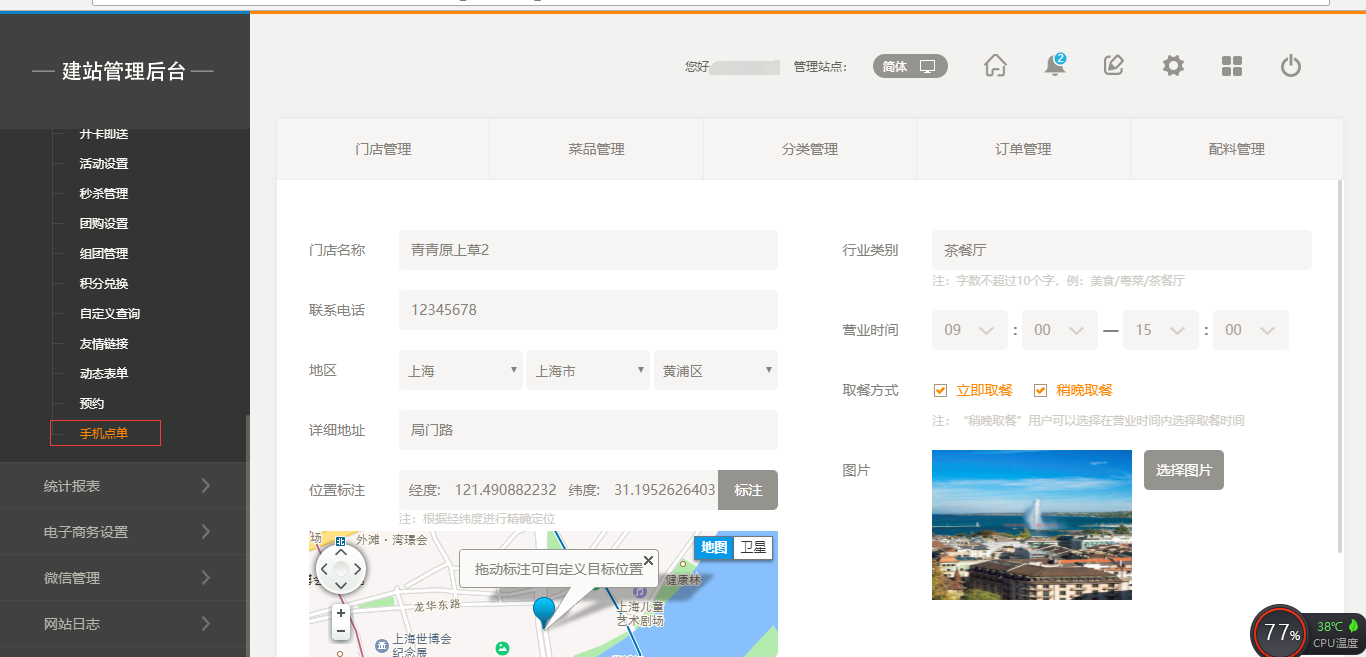 1.首先,點(diǎn)擊“后臺管理”-“手機(jī)點(diǎn)單”-“門店管理”-“添加門店”,填寫完店面信息之后,我們點(diǎn)擊保存即可(注:1.首先需要填寫店面的地址然后可以拖動地圖進(jìn)行精確;2.店面最多添加5家店面),保存之后,我們添加菜品時有兩個入口,一個是店面所對應(yīng)的入口,一個是在菜品管理中可以選擇所屬店面,如圖所示: