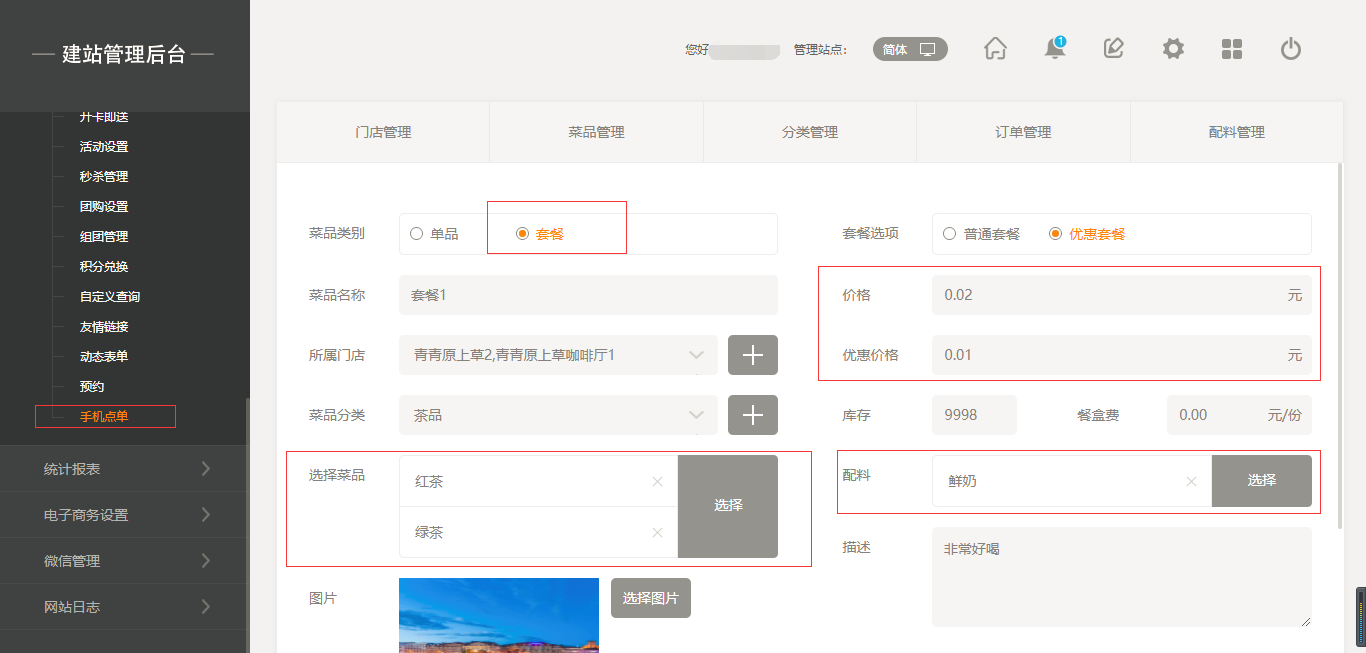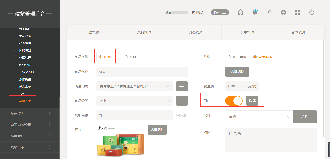 2.點(diǎn)擊“菜品管理”添加菜品,添加菜品時有兩種選項(xiàng),一個是“單品”,另一個是“套餐”,當(dāng)點(diǎn)擊“套餐”時,我們選擇之前添加好的單品進(jìn)行組合即可;當(dāng)添加菜品時,我們也可以給該菜品添加“口味”以及“配料”,同時我們也可以給該菜品進(jìn)行“規(guī)格”設(shè)置,如“大杯”“小杯”等,在前端添加菜品時都會體現(xiàn)出來,填寫完成后點(diǎn)擊保存即可,如圖所示: