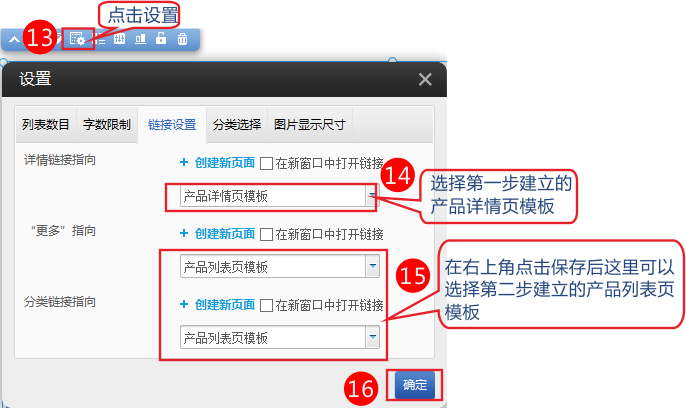 4,模塊上方點(diǎn)擊設(shè)置-鏈接設(shè)置。設(shè)置詳情鏈接和更多指向 分類鏈接指向。