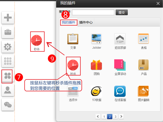 3,建立新頁面后,在此新頁面將“插件”里面的“秒殺插件”拖動出來,系統(tǒng)再次彈出以下選擇框: