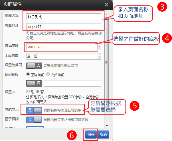 2,錄入頁面名稱-網(wǎng)頁地址-選擇好底板-導(dǎo)航頁設(shè)置為不顯示
